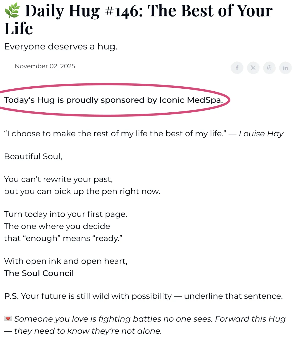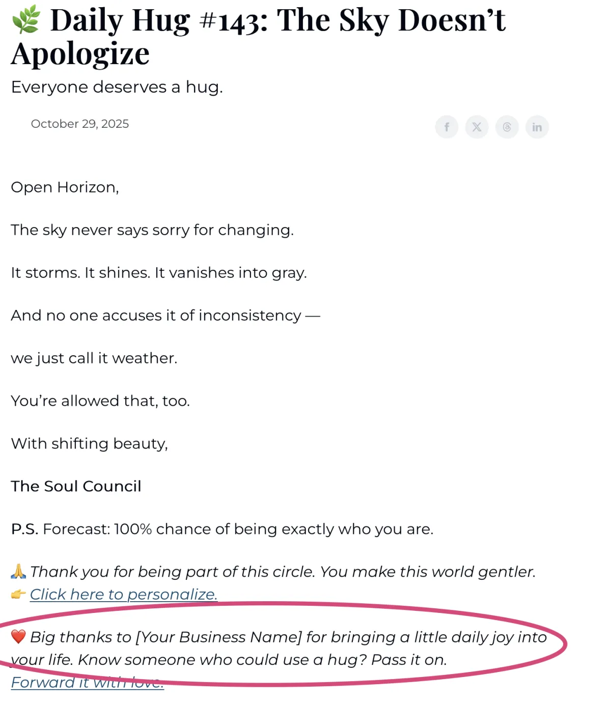 📩 Example Daily Hug your customers receive — short, uplifting, and sponsored by your business for 7 days.
